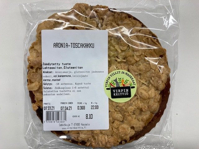 Ainekset: Aroniamarja, gluteeniton jauhoseos, sokeri, voi, kananmuna, leivinjauhe, kerma, manteli